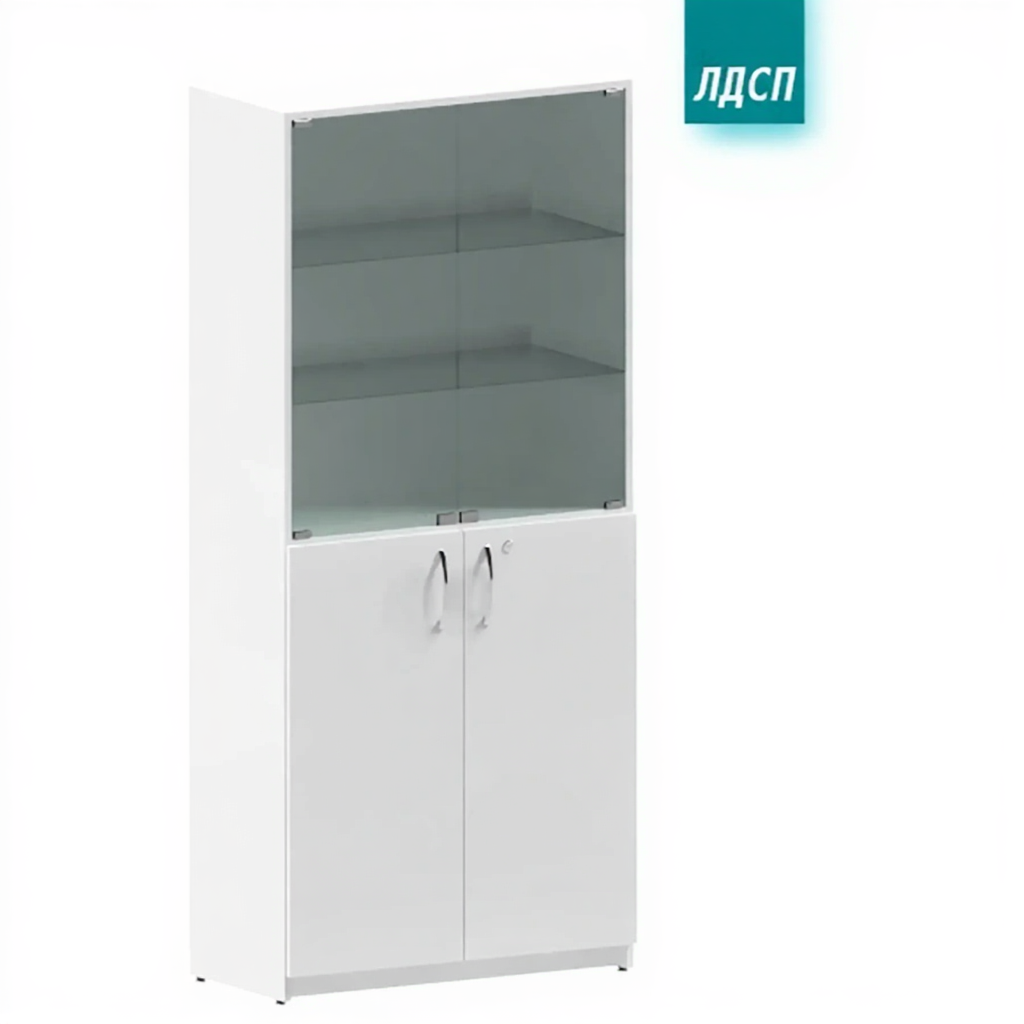 • 2 дверцы (нижние) из ЛДСП, 2 дверцы (верхние) из стекла, 2 полки (в нижней секции) из ЛДСП, 2 полки (в верхней секции) из стекла;