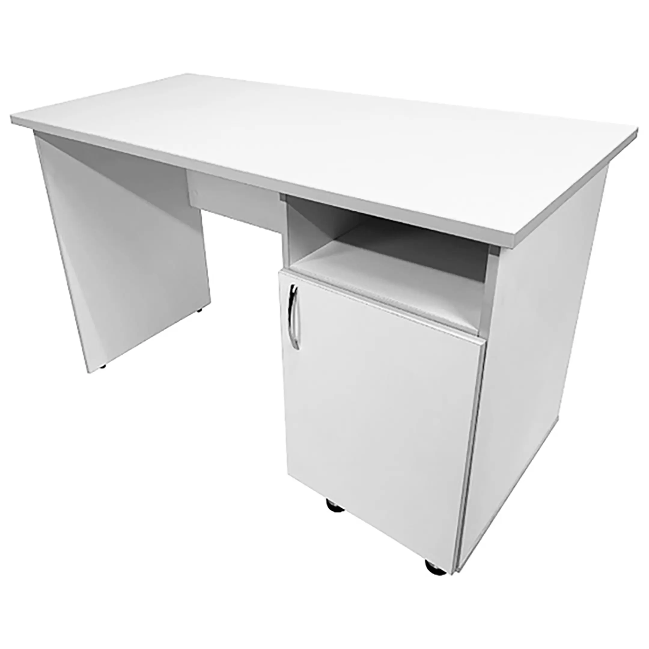• Стол оснащен боковой тумбой, оборудованной верхней открытой нишей и вместительным отделением с полкой, закрытым распашной дверкой.