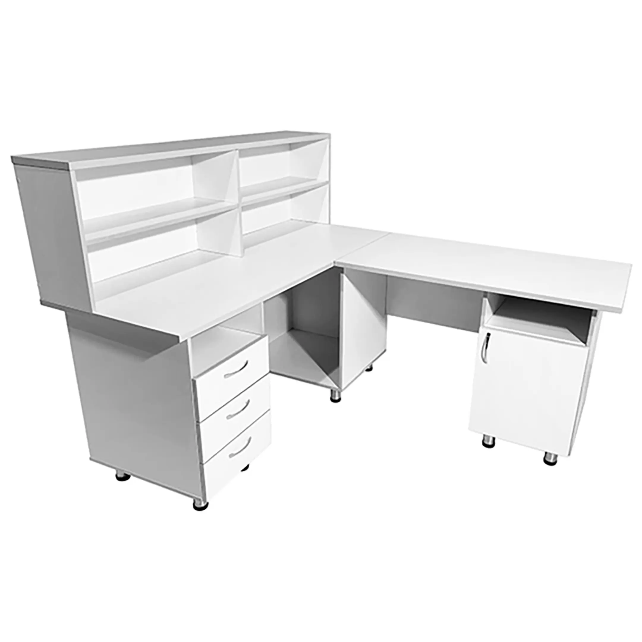 Стол-пост медицинский MD СтП 11.05 (белый) — это надежное и функциональное решение для обустройства рабочего места администратора в медицинских учреждениях. Модель выполнена из ЛДСП, имеет надстройку с полками под столешницей слева, тумбу с нишей и тремя выдвижными ящиками, а также тумбу с нишей и дверцей под столешницей справа.