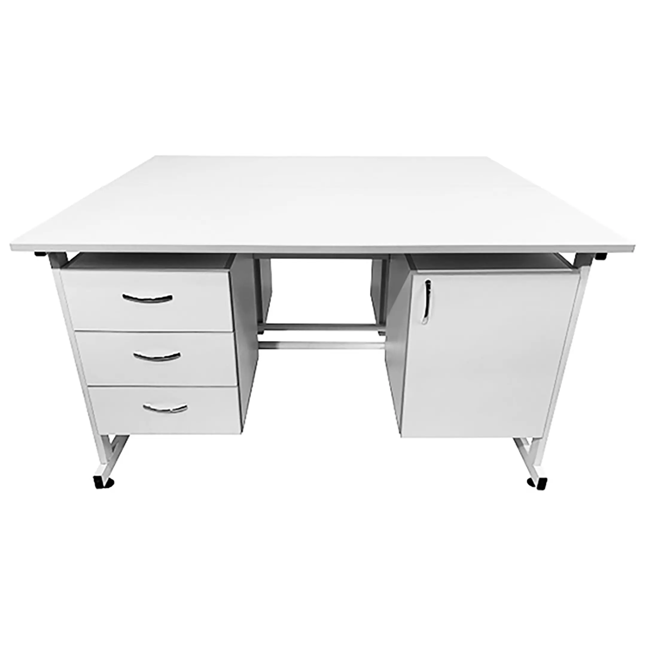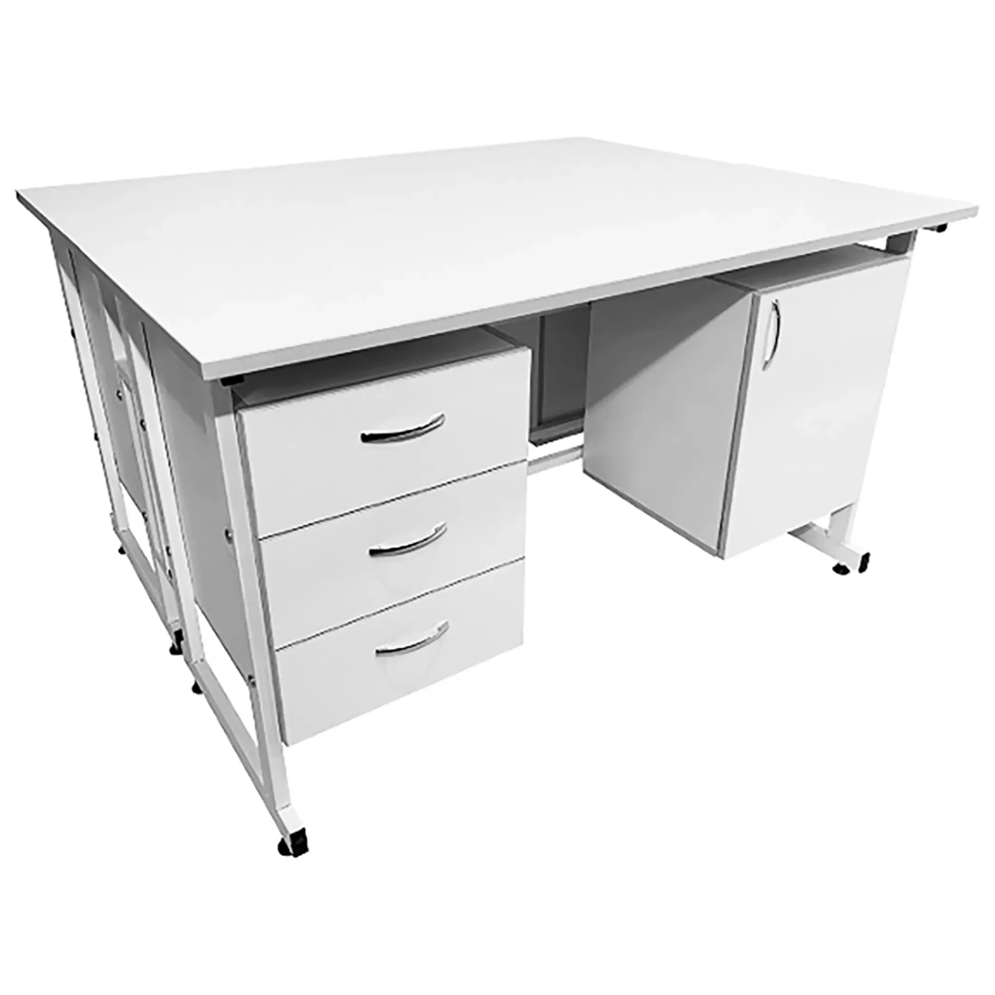 Стол лабораторный островной Сло 22.006 (белый) — это функциональное и стильное решение для организации двух рабочих мест в лабораториях, медицинских учреждениях и других профессиональных помещениях. Модель оснащена двумя рабочими местами, каждое с двумя подвесными тумбами: слева с тремя выдвижными ящиками, справа с распашной дверкой и полкой. Каркас выполнен из стального профиля, столешницы из ЛДСП толщиной 22 мм.