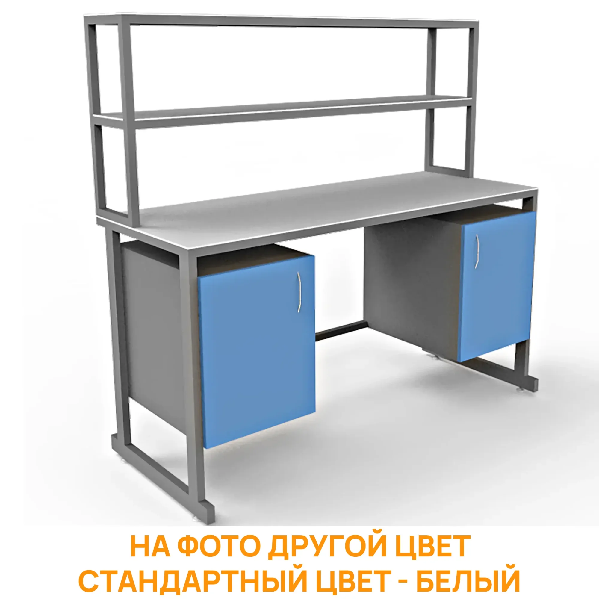 - Удобная система хранения — две тумбы под столешницей с распашными дверцами и надстройка с двумя полками для хранения материалов и оборудования.
