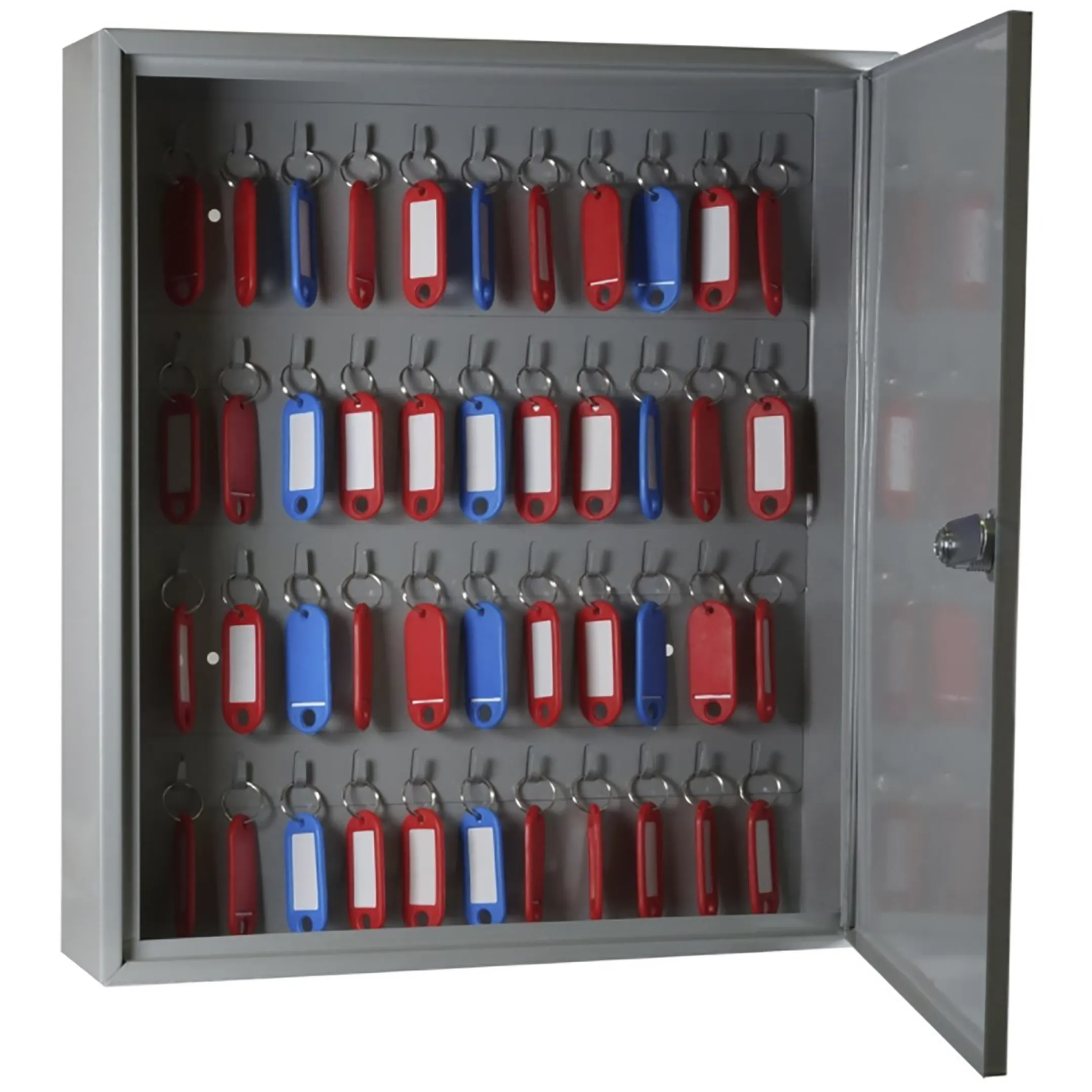 - Компактность и достаточная вместимость для типовых задач — ключница рассчитана на хранение 40 ключей, что является оптимальным решением для объектов с ограниченным количеством помещений, таких как небольшие офисы, студии, салоны, кабинеты или пункты приема клиентов. Ее размеры позволяют легко разместить шкаф на стене в удобном месте, не занимая много пространства.
