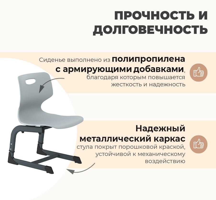 • Пластиковое сиденье и спинка — долговечные, лёгкие и легко очищаемые поверхности.