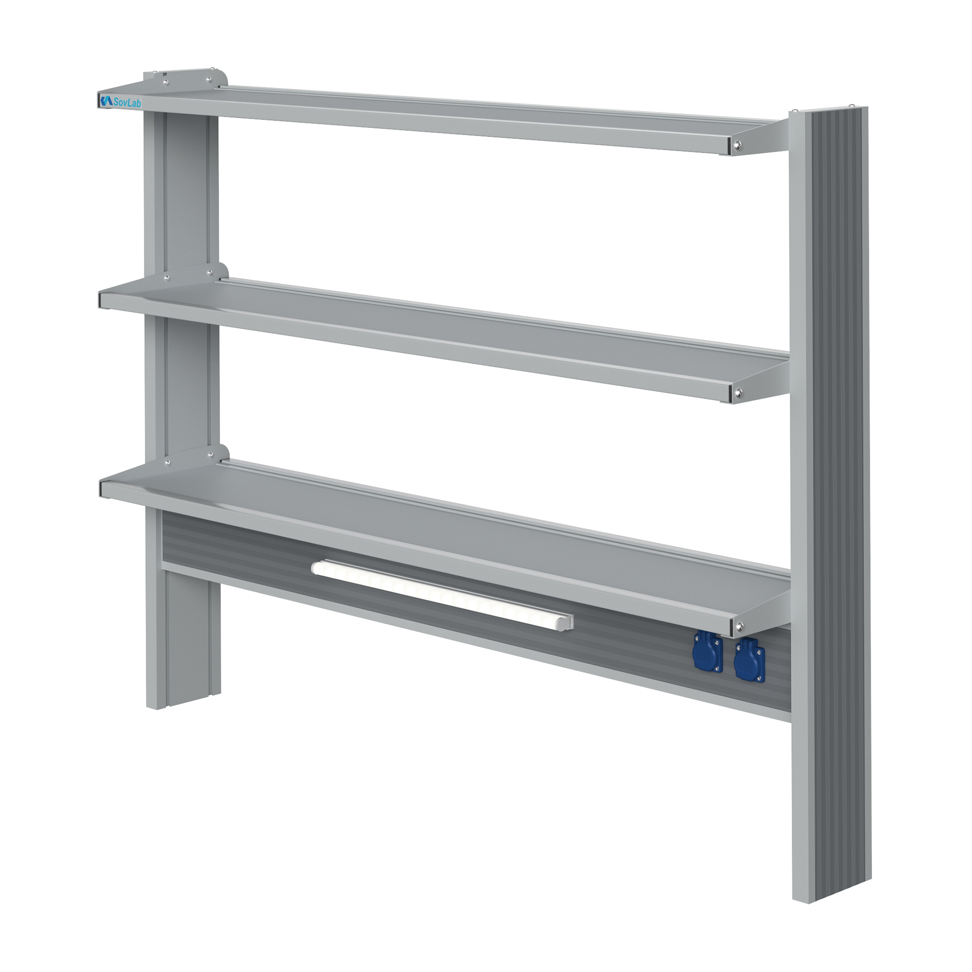 - Вместительная конструкция — три полки глубиной 300 мм в алюминиевых рамках позволяют разместить большое количество лабораторного инвентаря и оборудования.