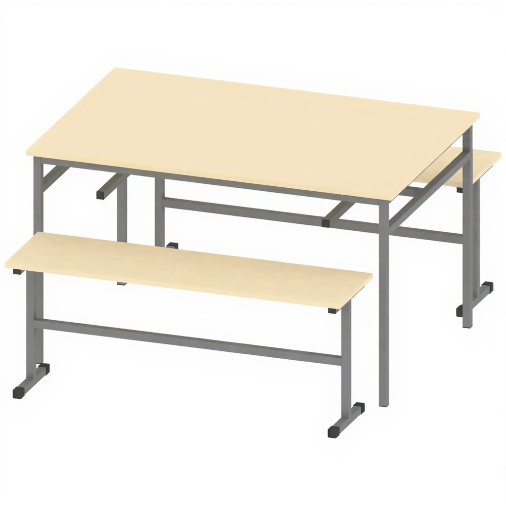 Стол обеденный с 2-мя скамейками МСТ-ШК-1, Крем с приятным оттенком украсит любую столовую зону в образовательных учреждениях, кафе и офисах. Изделия изготовлены из ЛДСП толщиной 16 мм, поверхностям которой придают дополнительную стойкость специальные кромочные ленты ПВХ 2 мм. Оригинальный дизайн усиливается прочным металлическим каркасом, обеспечивающим необходимую стабильность конструкции.