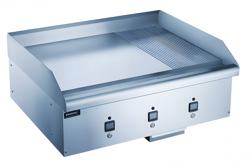- Комбинированная хромированная рабочая поверхность — 2/3 гладкая и 1/3 рифленая, размером 915х610 мм, толщиной 24 мм, с тремя независимими зонами нагрева, позволяет выбирать тип обработки в зависимости от продукта и готовить разные блюда одновременно.
