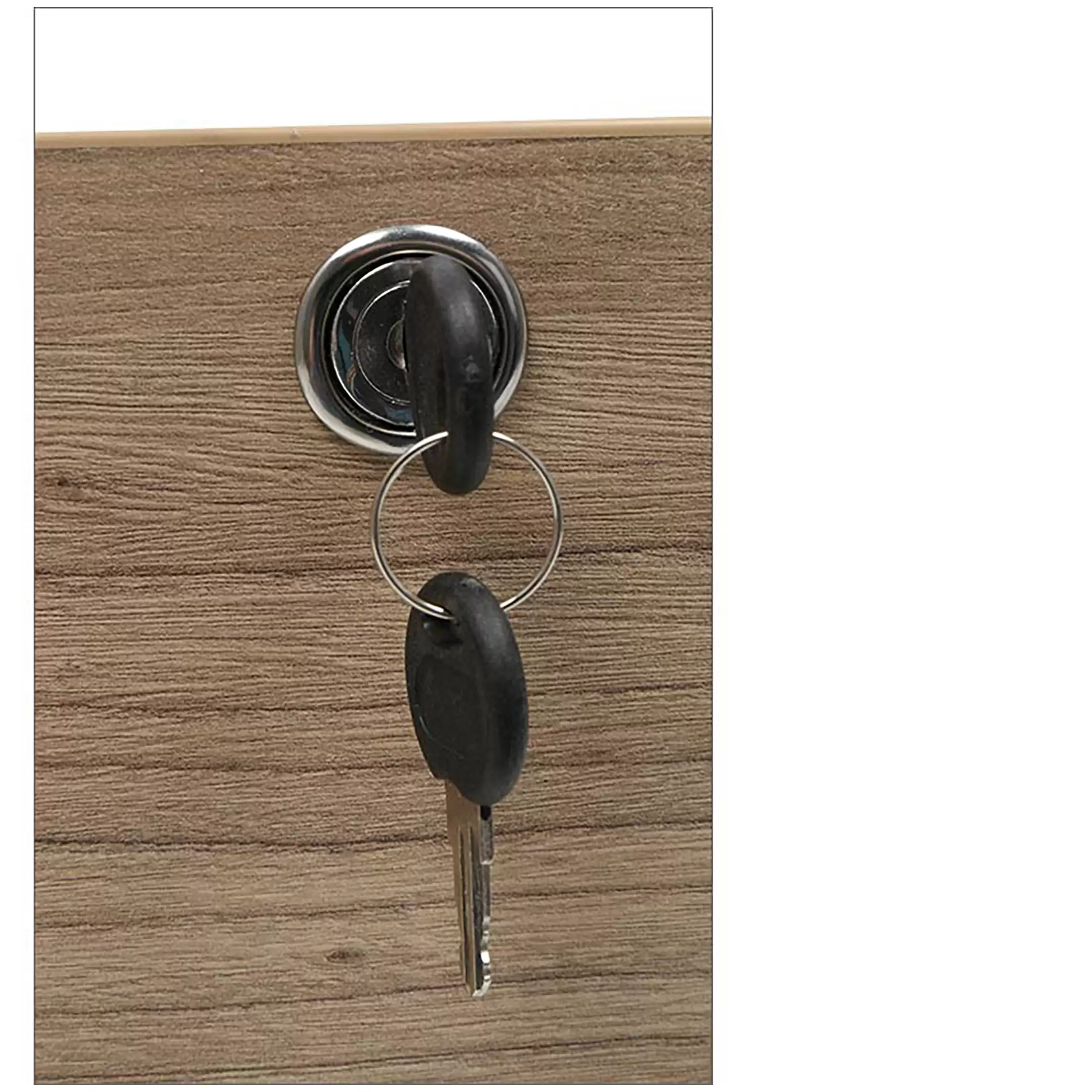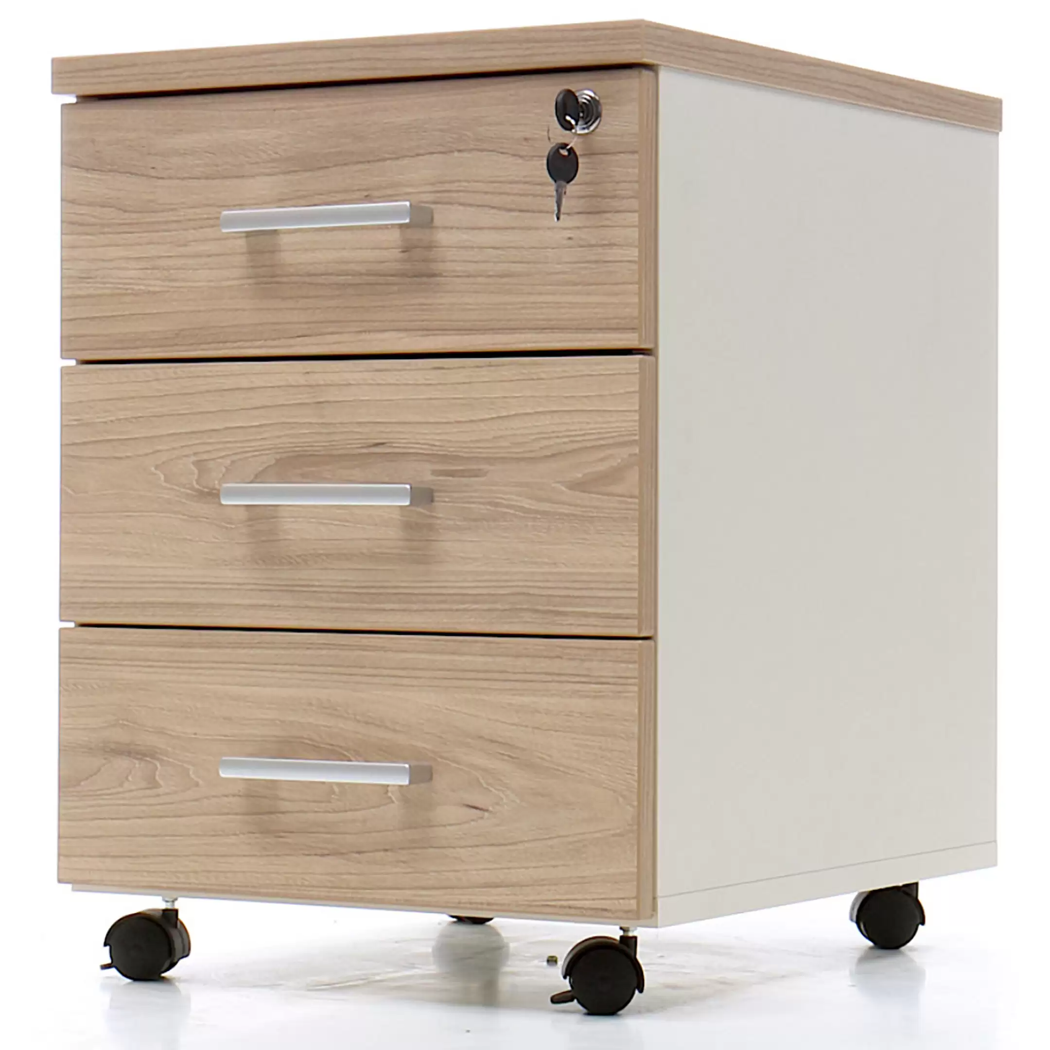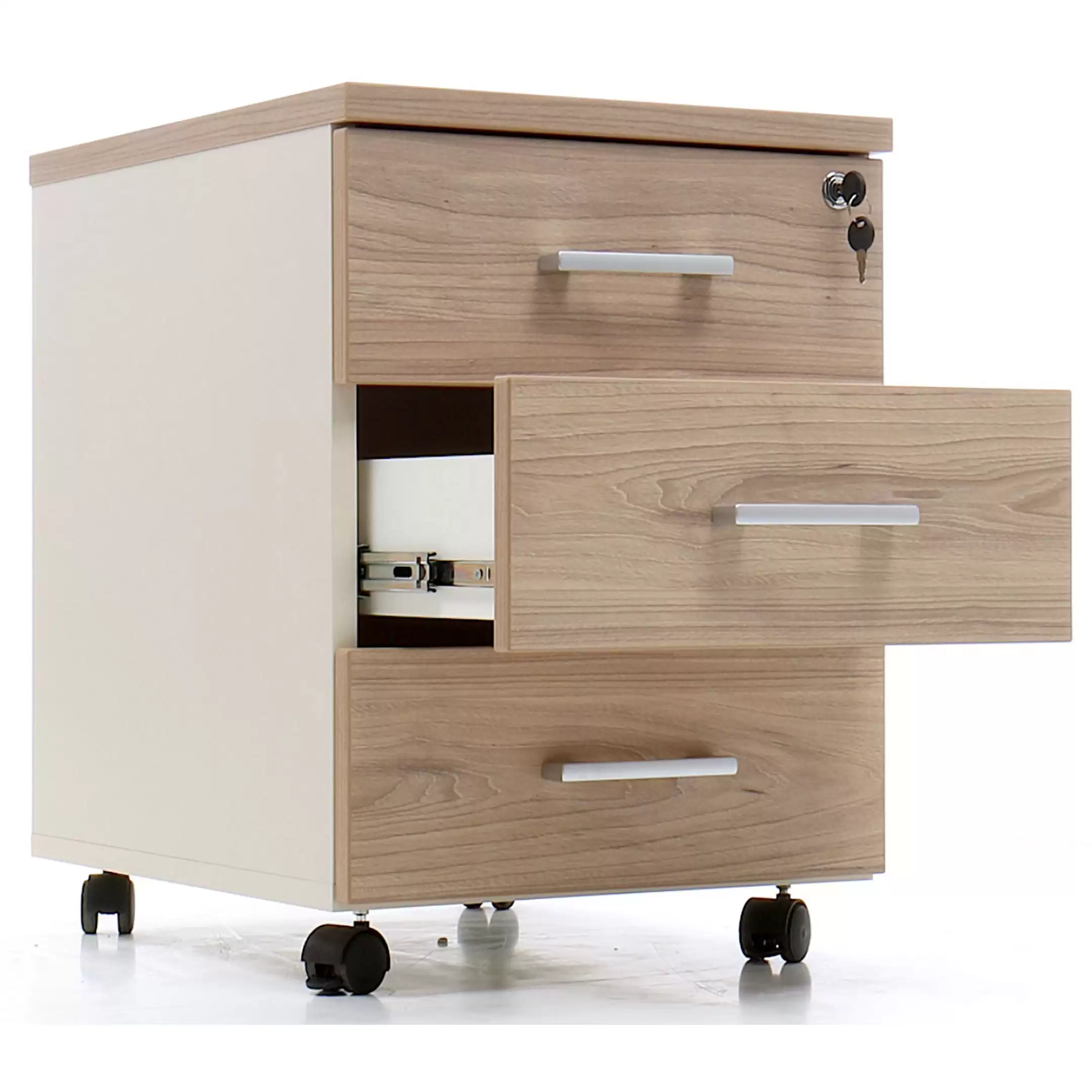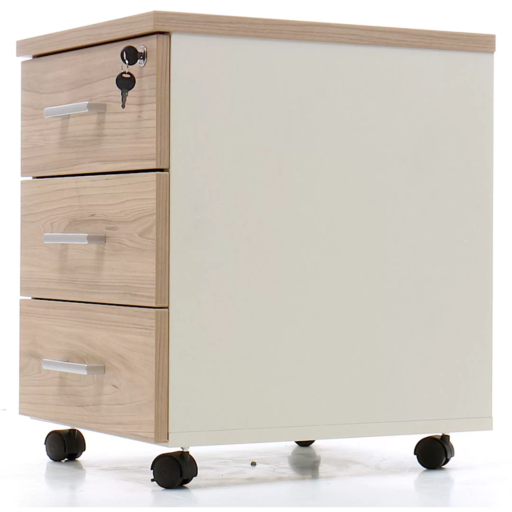 • запирается центральным замком и оснащена пластмассовым лотком для канцелярских принадлежностей в верхнем ящике;