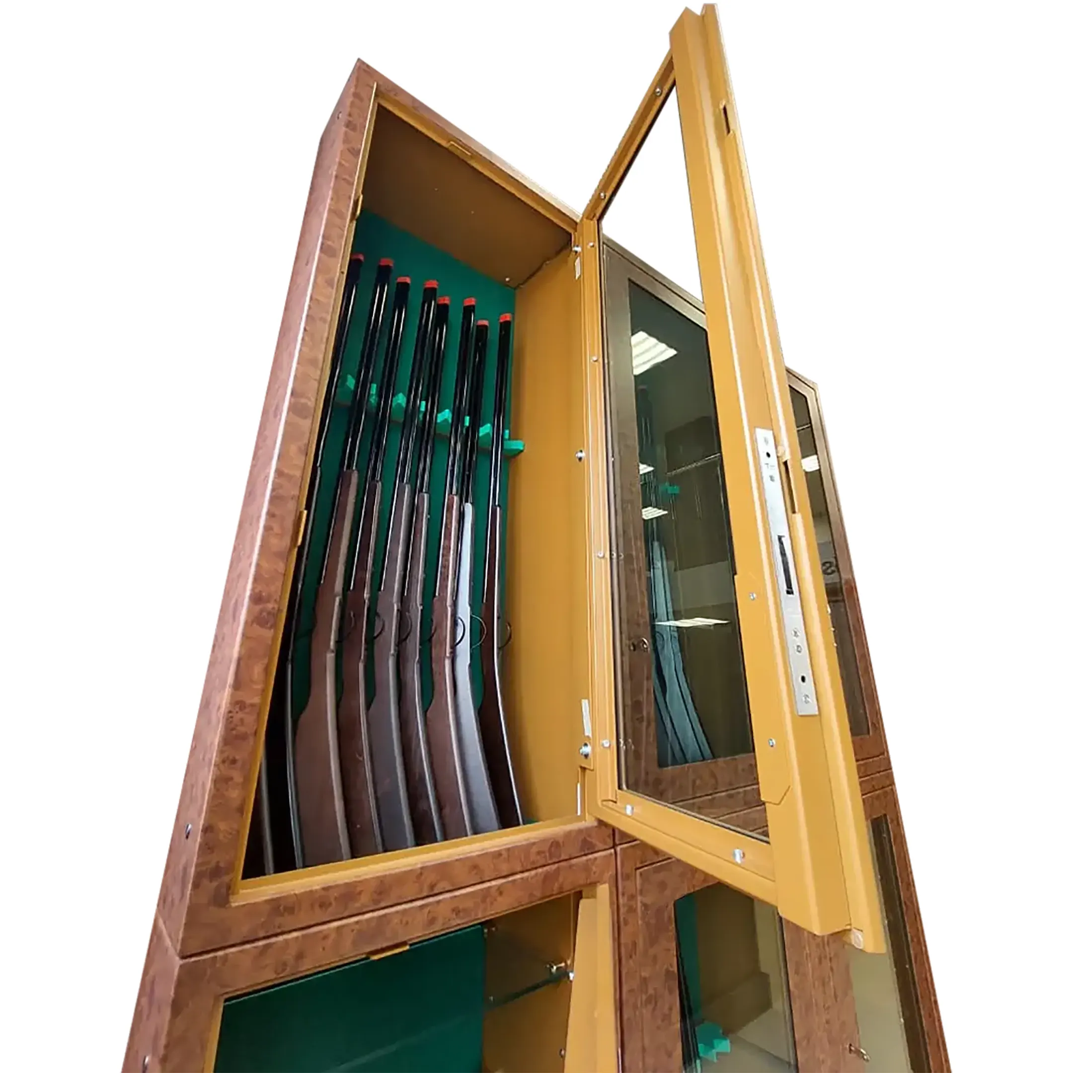 Безопасность бронированного шкафа обеспечивается за счет двухслойного каркаса из тугоплавкой стали. Дверные петли расположены внутри и вращаются на шарах, обеспечивая возможность регулирования открытия двери. Замок – ключевой, повышенной устойчивости к взломам.