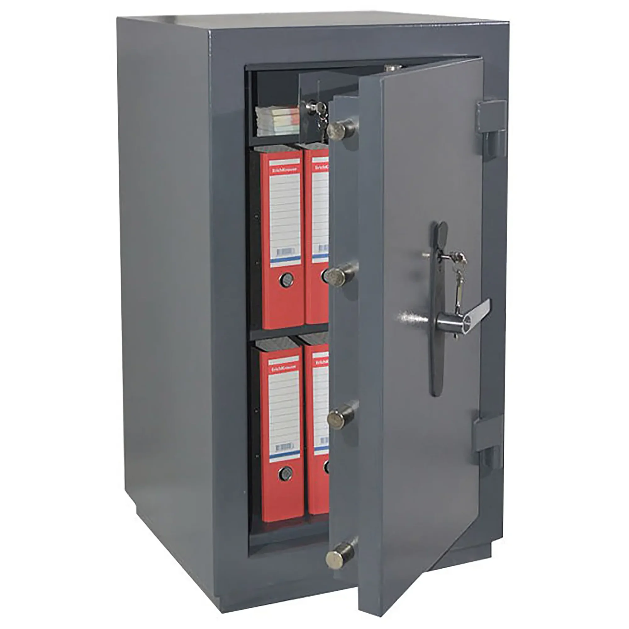 • сейф оборудован высококачественным запорным механизмом, который блокируется замком сувальдного типа (производство Германия), что обеспечивает необходимую для третьего класса надежность от взлома;