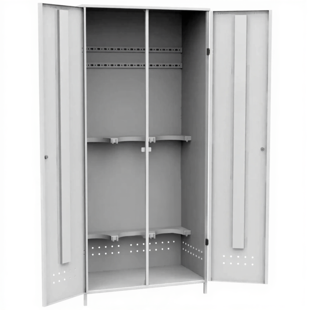 - Надежная защита имущества и удобство обслуживания — прочный запирающийся корпус защищает баллоны от краж. Приподнятая конструкция облегчает уборку под шкафом и визуальный осмотр его днища на предмет коррозии. Ножки также могут служить точками для дополнительного анкерного крепления к полу для повышения устойчивости.