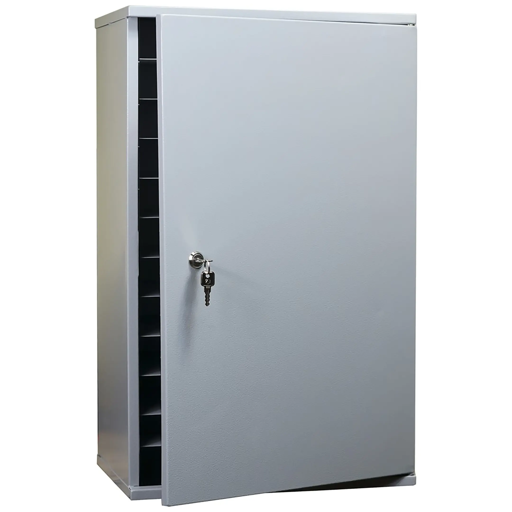 - Повышенная безопасность и защита от краж — каждая ячейка оборудована надежным замком с ключом, а общая конструкция шкафа выполнена из прочного металла, что обеспечивает максимальную защиту устройств от несанкционированного доступа и хищения.