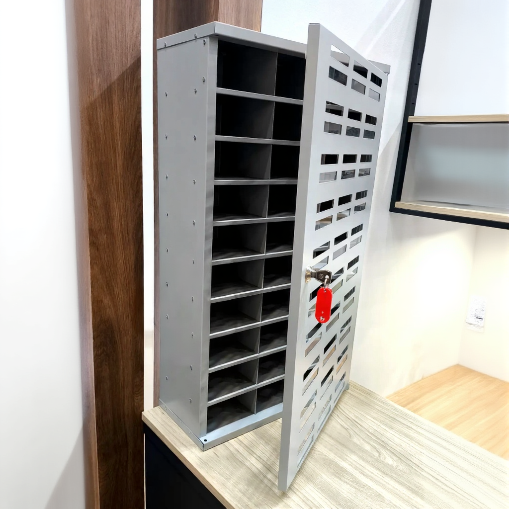 - Надежная защита и прочная конструкция — корпус изготовлен из высококачественной стали, а каждая ячейка оборудована собственным надежным замком. Это гарантирует максимальную безопасность хранения устройств от кражи и повреждений.