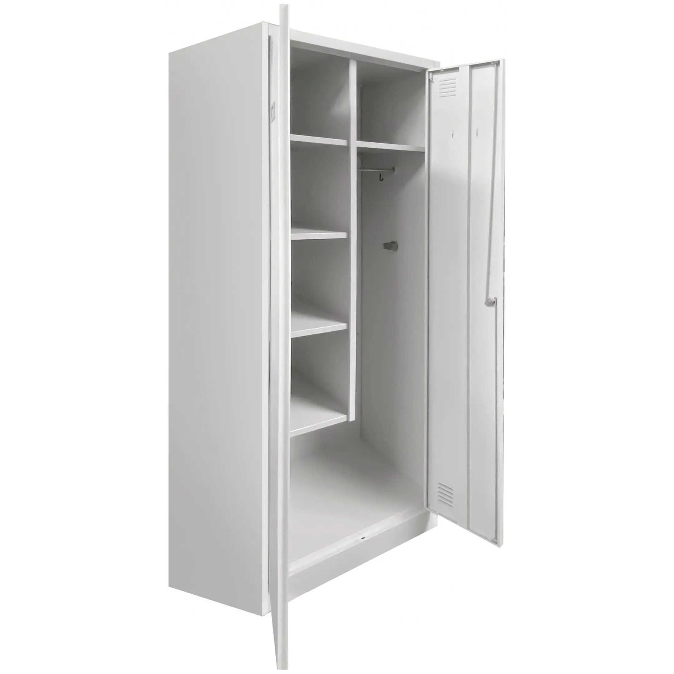 - Универсальность и адаптивность — шкаф может использоваться для хранения не только уборочного инвентаря, но и рабочей одежды, инструментов, запасных частей и других хозяйственных принадлежностей в зависимости от потребностей организации.