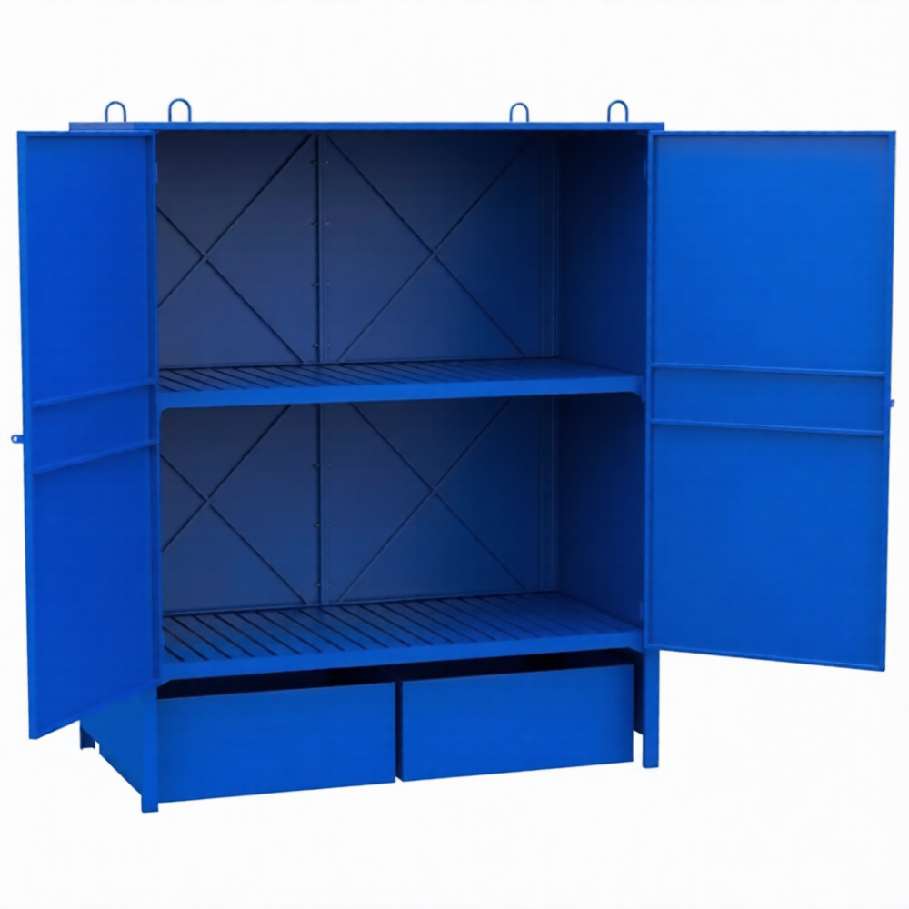 - Специализированная конструкция для еврокубов — шкаф спроектирован с учетом стандартных размеров IBC/KTC контейнеров (как правило, 1200x1000 мм в плане). Внутреннее пространство и расстояния между полками оптимизированы для безопасной установки, фиксации и извлечения заполненных емкостей с помощью погрузочной техники.