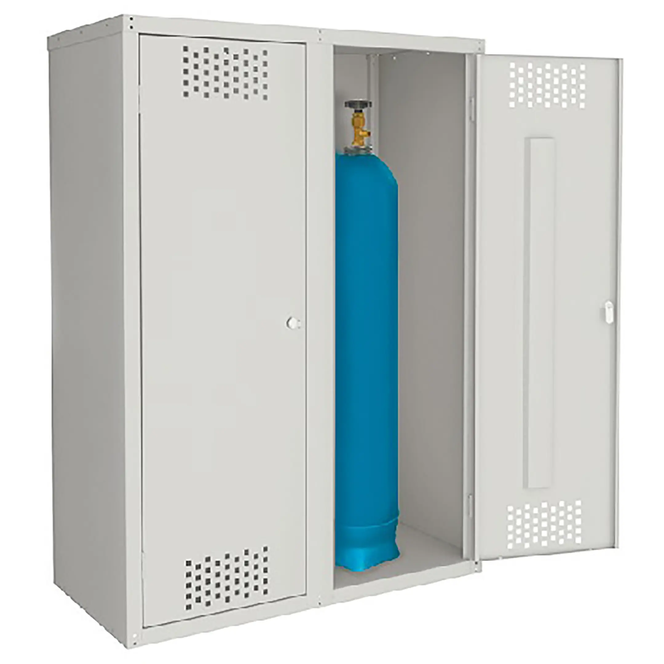 - Соблюдение строгих норм пожарной безопасности — шкаф изготовлен из огнестойкого металла и служит для изоляции двух газовых баллонов от возможных источников возгорания. Наличие вентиляционных отверстий (жалюзи) в нижней и верхней частях корпуса обеспечивает постоянный приток воздуха и отвод тяжелого газа в случае утечки, не допуская его накопления внутри.