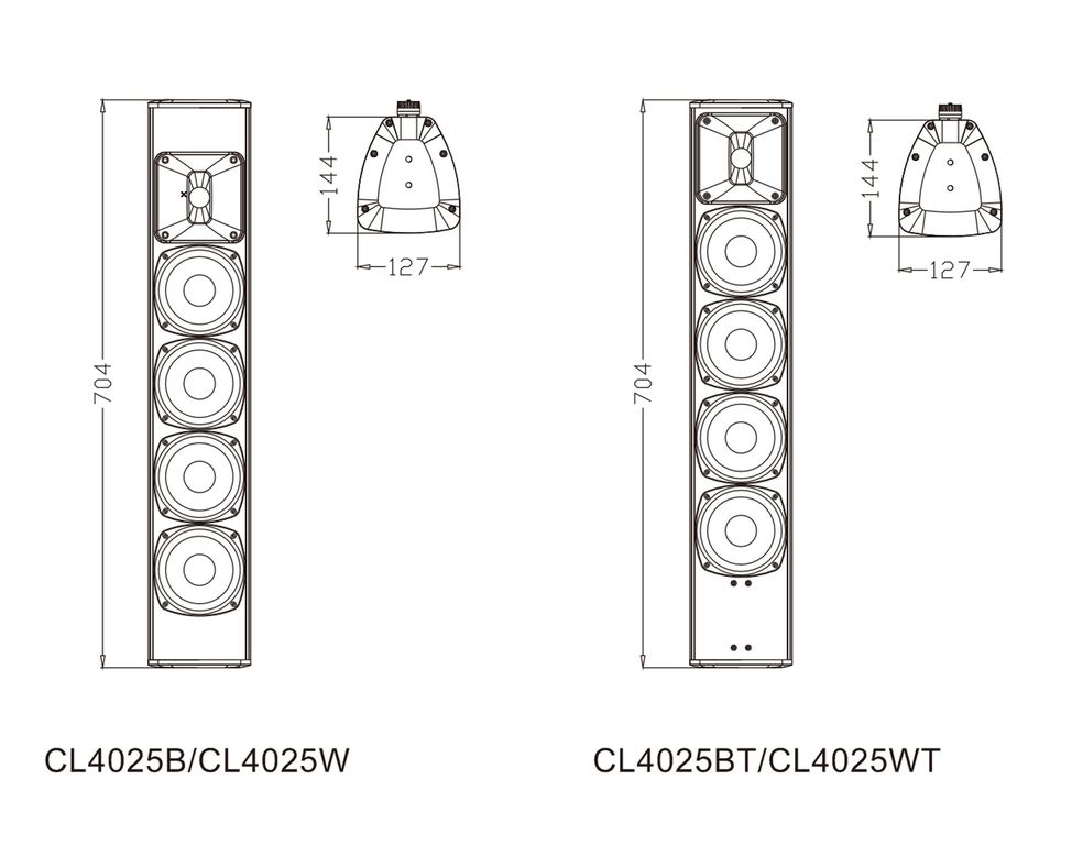 Серия CL4025 представляет собой акустическую систему колонного типа с различными цветами и функциями. Продукт соответствует стандарту IP56. Звук мягкий и сбалансированный. Корпус изготовлен из алюминиевого сплава. Буквы B и W после модели обозначают черный и белый цвет соответственно, а буква T представляет собой конфигурацию с трансформатором.